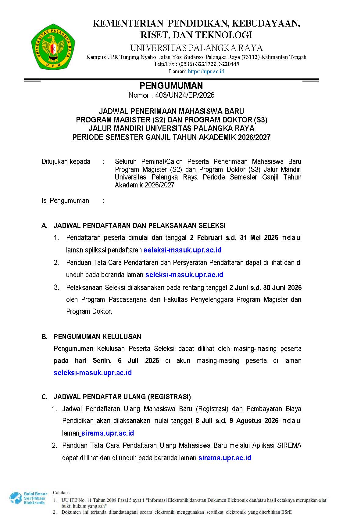 JADWAL PENERIMAAN MAHASISWA BARU PROGRAM MAGISTER (S2) DAN PROGRAM DOKTOR (S3) JALUR MANDIRI UNIVERSITAS PALANGKA RAYA PERIODE SEMESTER GANJIL TAHUN AKADEMIK 2026/2027
